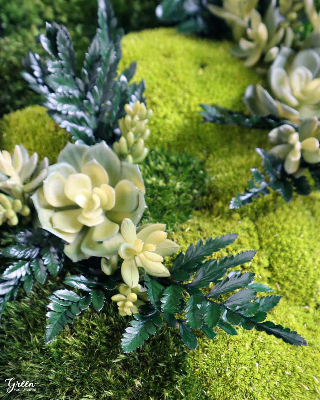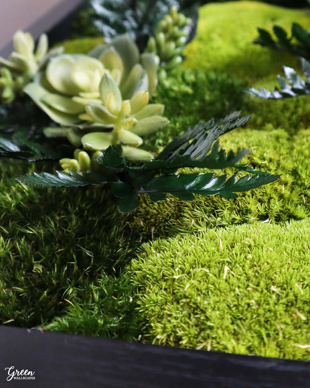 This mini moss and succulent plant painting is designed with preserved materials including ferns and luxury faux succulents in a classic green color palette! This is an 11" x 14" frame that can be easily incorporated into any interior space looking to add a little garden on their wall!
