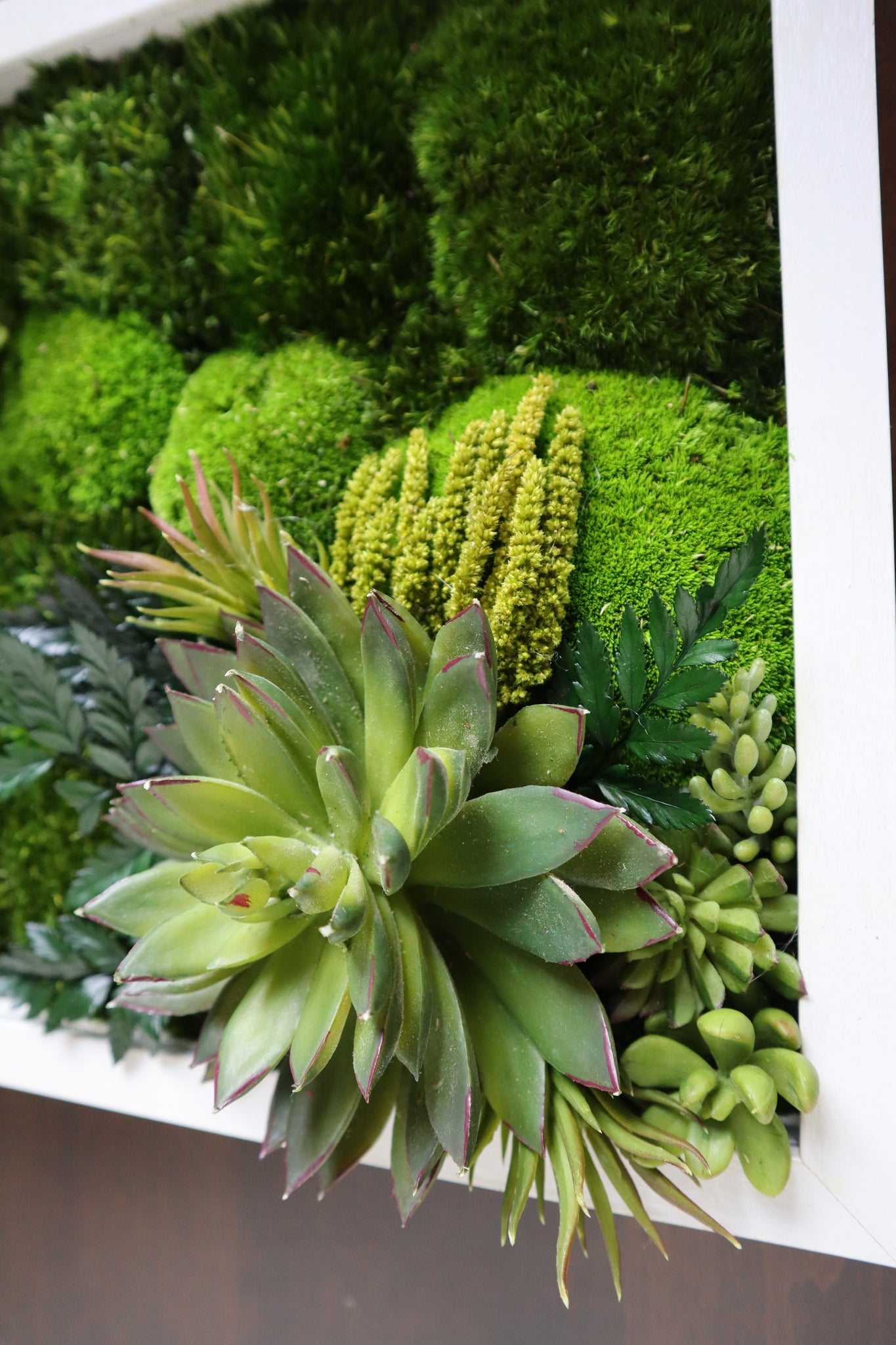 This mini moss and succulent plant painting is designed with preserved materials including ferns and luxury faux succulents in a classic green color palette! This is an 11" x 14" frame that can be easily incorporated into any interior space looking to add a little garden on their wall!